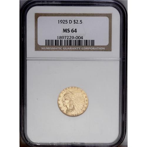 <B>1925-D $2 1/2 MS64 NGC.</B></I> Set in the typical honey-gold with luster that is phenomenal for the issue. Several light marks do exist in the fields, but this is more the norm than the exception for the type. Overall, an impressive near-Gem that is sure to please even the picky collector.