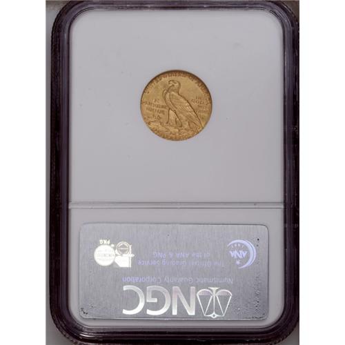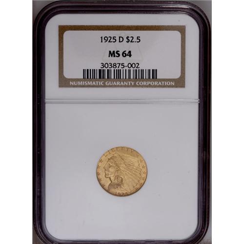<B>1925-D<$2 1/2> MS64 NGC.</B></I> Soft luster peeks through brassy-gold patina on this '25-D quarter eagle. Very nice definition is apparent on the design features, and a handful of miniscule marks in the reverse fields limits the grade.