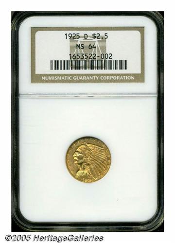 <B>1925-D<$2 1/2> MS64 NGC.</B></I> The obverse is ultra frosty and borderline Gem quality, while the reverse is brighter in appearance and exhibits a few grade-limiting marks.