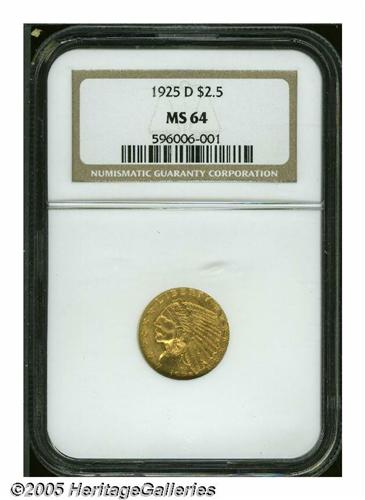 <B>1925-D<$2 1/2> MS64 NGC.</B></I> Well struck with full, bright luster. Light scrapes in the upper obverse field, and a couple of minor contact marks on the Indian's cheek, prevent a higher grade.