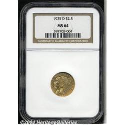 <B>1925-D<$2 1/2> MS64 NGC.</B></I> Apricot-gold color with greenish undertones. Nicely struck, with just a couple miniscule marks. <BR><BR><B>Important notice:</B> Heritage usually auctions material at the rate of 200-250 lots per hour. On some occasions eBay Live bid software or the Internet may not be able to keep up with the pace of the auction. We recommend placing a realistic absentee bid now as insurance to avoid disappointment. Occasionally the auctioneer may eliminate or reject an eBay Live bid, and the auctioneer may also reopen a lot after the close of the eBay live bidding (usually because we missed an audience bid), and may reject your bid even if it shows you as the winning bidder. By bidding via eBay Live, you agree that Heritage may award the lot to another bidder at its sole discretion under the circumstances described above or any other reasonable circumstances. Since eBay bids are not shown to us until we open the lot on the floor, we treat those bids just like floor bids. In most cases the floor responds before the eBay bid is presented to us, due to Internet lag time, so for consistency we have made it a policy that floor bids are always considered first over tie eBay live bids. Also please note that all Heritage lots purchased through eBay Live carry a 20% Buyer's Premium. Please make sure you read the Terms and Conditions before you bid. </span></font></tr></table></td></tr></table>