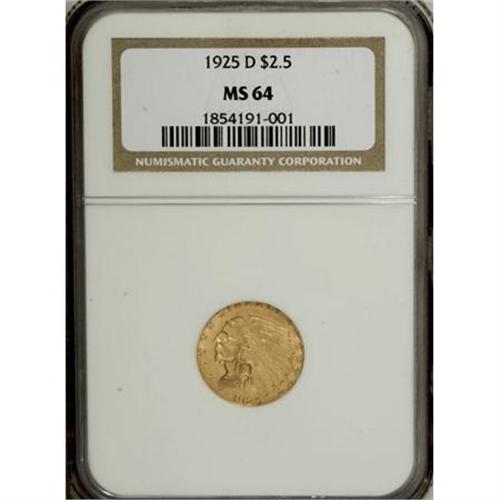 <B>1925-D $2 1/2 MS64 NGC.</B></I> A frosty representative, this attractive piece has brilliant yellow-gold surfaces and full luster. Both sides are slightly weak at the center.<BR><BR><b>Shipping:</b> Coins & Currency (<a target="_blank" href="http://www.heritageauctions.com/common/shipping.php">view shipping information</a>)
