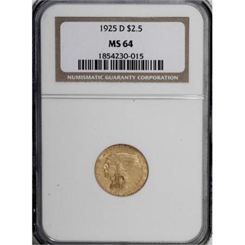 <B>1925-D $2 1/2 MS64 NGC.</B></I> Some blending of detail is noted on the lower headdress, but the strike is otherwise precise, and the softly glowing fields display only inconsequential marks. Struck from moderately rotated dies.<BR><BR><b>Shipping:</b> Coins & Currency (<a target="_blank" href="http://www.heritageauctions.com/common/shipping.php">view shipping information</a>)