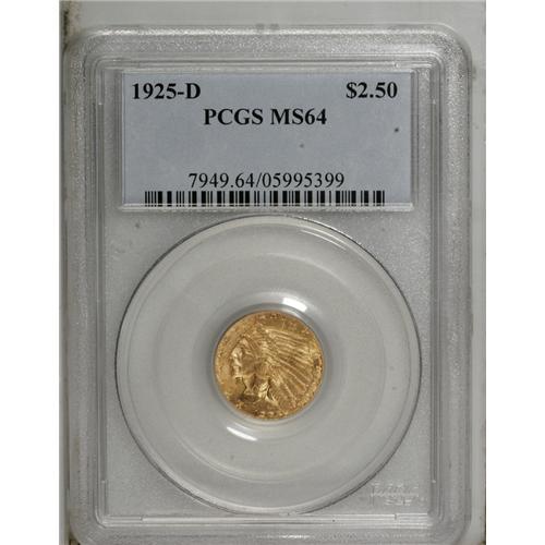 <B>1925-D $2 1/2 MS64 PCGS.</B></I> A boldly impressed wheat-gold piece with magnificent luster. Only minor abrasions under the T in Liberty keep this coin out of the Gem level<BR><BR><b>Shipping:</b> Coin/Currency (<a target="_blank" href="http://www.heritageauctions.com/common/shipping.php">view shipping information</a>)