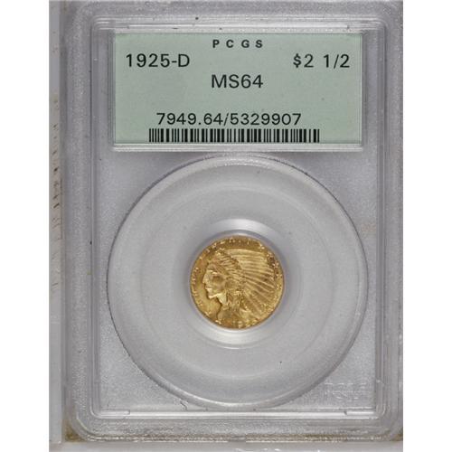 <B>1925-D<$2 1/2> MS64 PCGS.</B></I> A boldly struck near-Gem with subtly lustrous gold-orange surfaces. A minimally marked and appealing piece housed in an early holder.