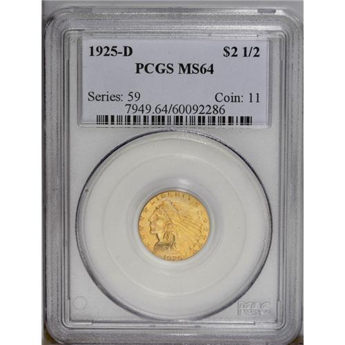 <B>1925-D<$2 1/2> MS64 PCGS.</B></I> A lovely D-mint near-Gem with vibrant apricot hues and subtle sky-blue colors. While not uncommon in and of itself, the eye appeal certainly helps to differentiate this piece. <BR><BR><B>Important notice:</B> Heritage usually auctions material at the rate of 200-250 lots per hour. On some occasions eBay Live bid software or the Internet may not be able to keep up with the pace of the auction. We recommend placing a realistic absentee bid now as insurance to avoid disappointment. Occasionally the auctioneer may eliminate or reject an eBay Live bid, and the auctioneer may also reopen a lot after the close of the eBay live bidding (usually because we missed an audience bid), and may reject your bid even if it shows you as the winning bidder. By bidding via eBay Live, you agree that Heritage may award the lot to another bidder at its sole discretion under the circumstances described above or any other reasonable circumstances. Since eBay bids are not shown to us until we open the lot on the floor, we treat those bids just like floor bids. In most cases the floor responds before the eBay bid is presented to us, due to Internet lag time, so for consistency we have made it a policy that floor bids are always considered first over tie eBay live bids. Also please note that all Heritage lots purchased through eBay Live carry a 20% Buyer's Premium. Please make sure you read the Terms and Conditions before you bid. This lot is being auctioned in conjunction with a live floor auction by Heritage Galleries & Auctioneers. All final auction and invoice information will be supplied by Heritage Galleries & Auctioneers, and all other information should be considered preliminary. Lot:2517 <BR><BR><B>Winning Notification and Billing:</B> After the FINAL session in this auction is complete, Heritage will send e-mail and snail mail invoices. This process normally takes several days. All final auction and invoice information will be supplied by Heritage Galleries & Auctioneers, and all other information should be considered preliminary. <BR><BR>This auction will be conducted on a live auction floor and over the Internet through eBay Live. If you choose to place an absentee bid, please take a moment to <font color='#0000ff'><u><a href='http://pages.ebay.com/liveauctions/help/before/laabsentee.html'>learn how eBay Live absentee bidding works</a></u></font><font color='#000000'>