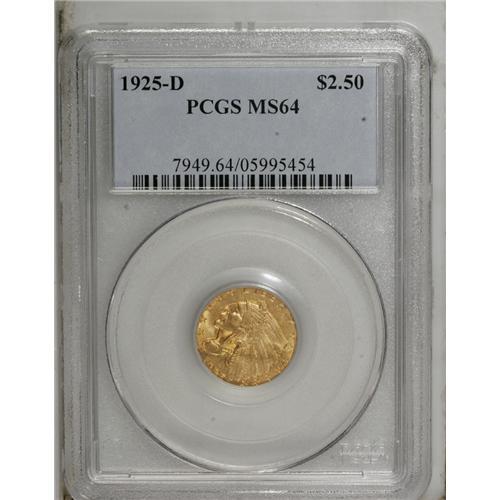 <B>1925-D $2 1/2 MS64 PCGS.</B></I> A typically struck piece with satiny wheat-gold surfaces. Minor abrasions on the reverse keep this coin from Gem status.<BR><BR><b>Shipping:</b> Coin/Currency (<a target="_blank" href="http://www.heritageauctions.com/common/shipping.php">view shipping information</a>)