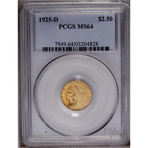 <B>1925-D<$2 1/2> MS64 PCGS.</B></I> Brassy copper-gold and mint-green toning is illuminated by shimmering luster on each side of this well struck near-Gem. A handful of minor nicks in the reverse fields prevent a higher grade assessment.