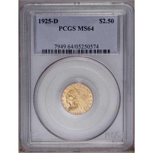 <B>1925-D<$2 1/2> MS64 PCGS.</B></I> Bright and boldly struck with subtly variegated coloration and just a few wispy marks in the left obverse field that seemingly prevent the Gem grade. This is the highest mintage issue of the Denver Mint for this popular series.