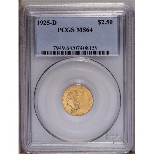 <B>1925-D<$2 1/2> MS64 PCGS.</B></I> Intricately detailed on both sides with rose-gold hints throughout. Difficult to locate at the next level. <BR><BR><B>Important notice:</B> Heritage usually auctions material at the rate of 200-250 lots per hour. On some occasions eBay Live bid software or the Internet may not be able to keep up with the pace of the auction. We recommend placing a realistic absentee bid now as insurance to avoid disappointment. Occasionally the auctioneer may eliminate or reject an eBay Live bid, and the auctioneer may also reopen a lot after the close of the eBay live bidding (usually because we missed an audience bid), and may reject your bid even if it shows you as the winning bidder. By bidding via eBay Live, you agree that Heritage may award the lot to another bidder at its sole discretion under the circumstances described above or any other reasonable circumstances. Since eBay bids are not shown to us until we open the lot on the floor, we treat those bids just like floor bids. In most cases the floor responds before the eBay bid is presented to us, due to Internet lag time, so for consistency we have made it a policy that floor bids are always considered first over tie eBay live bids. Also please note that all Heritage lots purchased through eBay Live carry a 20% Buyer's Premium. Please make sure you read the Terms and Conditions before you bid. This lot is being auctioned in conjunction with a live floor auction by Heritage Galleries & Auctioneers. All final auction and invoice information will be supplied by Heritage Galleries & Auctioneers, and all other information should be considered preliminary. Lot:2516 <BR><BR><B>Winning Notification and Billing:</B> After the FINAL session in this auction is complete, Heritage will send e-mail and snail mail invoices. This process normally takes several days. All final auction and invoice information will be supplied by Heritage Galleries & Auctioneers, and all other information should be considered preliminary. <BR><BR>This auction will be conducted on a live auction floor and over the Internet through eBay Live. If you choose to place an absentee bid, please take a moment to <font color='#0000ff'><u><a href='http://pages.ebay.com/liveauctions/help/before/laabsentee.html'>learn how eBay Live absentee bidding works</a></u></font><font color='#000000'>