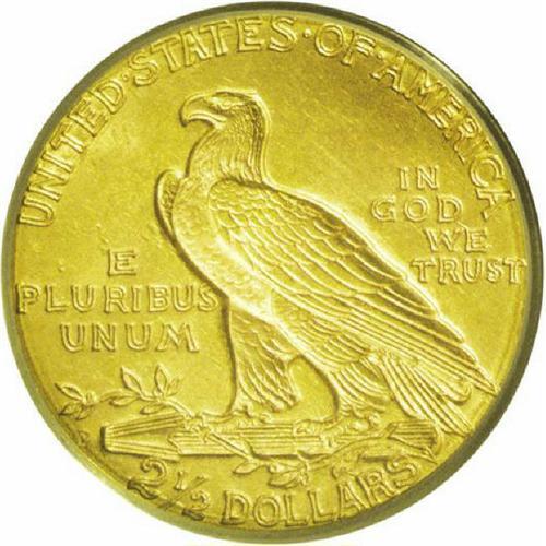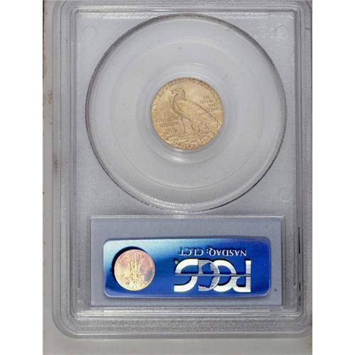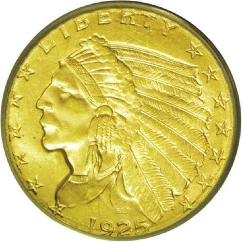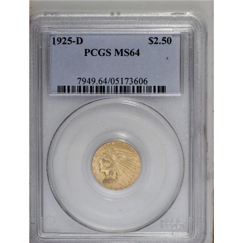 <B>1925-D<$2 1/2> MS64 PCGS.</B></I> Knowledgeable collectors of this series know that its incuse design, making the fields the highpoints of the coin, exposes those fields to scratches, contact marks from other coins, and various other potential surface insults. A coin such as the present near-Gem rises or falls chiefly on the quantity, degree, and location of those surface marks. This piece is free of all but minuscule ticks on the Indian's cheek, with a small nick above the head. But it shows much less abrasions than typical, along with lustrous honey-gold surfaces and a good strike.