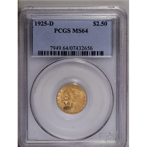 <B>1925-D<$2 1/2> MS64 PCGS.</B></I> Rich golden-orange color and subtle greenish undertones, and a noticeably weak strike in the centers, especially on the reverse. Wispy handling marks occur in the upper reverse field.