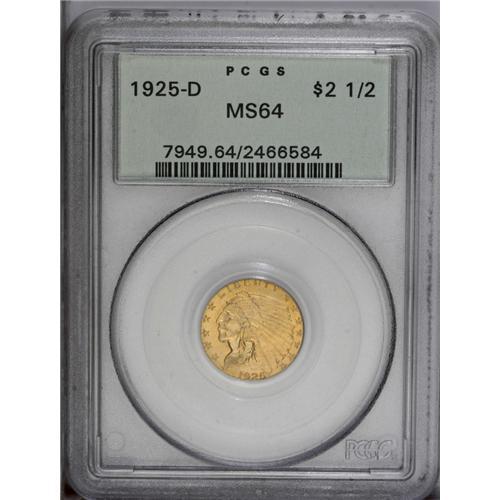 <B>1925-D<$2 1/2> MS64 PCGS.</B></I> Seemingly a premium quality example for the grade with smooth yellow-gold surfaces on both sides and razor sharp design details. Housed in an older green PCGS holder.