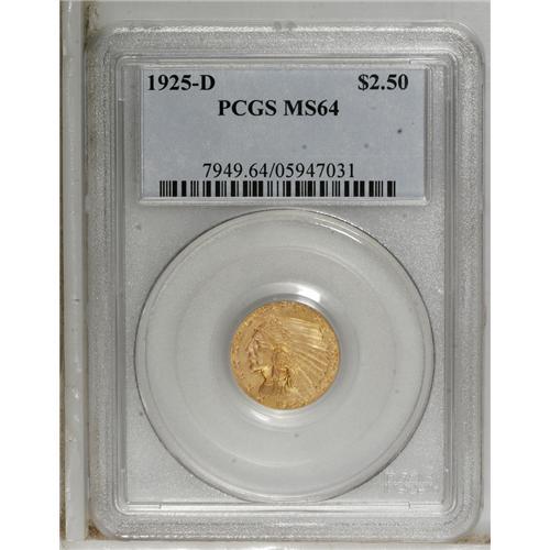 <B>1925-D $2 1/2 MS64 PCGS.</B></I> The rose-gold surfaces have a brassy, coppery appearance on the reverse. Frosty and Gemlike on the blemish-free obverse; the reverse shows several faint field abrasions. The most common issue in the series in Mint State, according to Akers.<BR><BR><b>Shipping:</b> Coins & Currency (<a target="_blank" href="http://www.heritageauctions.com/common/shipping.php">view shipping information</a>)