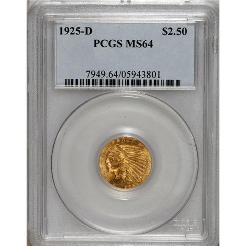 <B>1925-D $2 1/2 MS64 PCGS.</B></I> Well produced with a sharp mintmark and unusually bright, vibrant luster. The champagne-gold coloration is also quite alluring, and the surfaces are nicely preserved, with few marks.<BR><BR><b>Shipping:</b> Coins & Currency (<a target="_blank" href="http://www.heritageauctions.com/common/shipping.php">view shipping information</a>)
