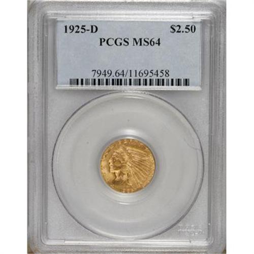 <B>1925-D $2 1/2 MS64 PCGS.</B></I> The first coinage for the denomination in a decade would be the last for Denver, as quarter eagles were struck in Philadelphia only from 1926 on. This well struck apricot-gold example has soft, shimmering luster and few marks on the obverse.<BR><BR><b>Shipping:</b> Coins & Currency (<a target="_blank" href="http://www.heritageauctions.com/common/shipping.php">view shipping information</a>)