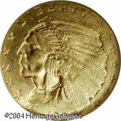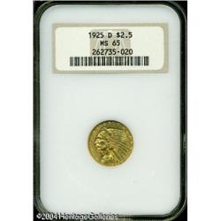 1925-D $2 1/2 MS65 NGC. The '25-D is important as <B>1925-D $2 1/2 MS65 NGC.</B></I> The '25-D is important as the only mintmarked Indian Quarter Eagle from the 1920s. This issue (578,000 pieces produced) is the most common of the type in all Mint State grades short of MS65, where it is surpassed by the first-year 1908. The present example is alive with thick, rich, yellow-gold color. Richly frosted, both sides are free of outwardly distracting abrasions. Some unevenness of strike is seen on the obverse over the ends of the feathers in the Indian's headdress, but we stress that the definition in that area is well above average for the type. Attractive. <BR><BR><B>Important notice:</B> Heritage usually auctions material at the rate of 200-250 lots per hour. On some occasions eBay Live bid software or the Internet may not be able to keep up with the pace of the auction. We recommend placing a realistic absentee bid now as insurance to avoid disappointment. Occasionally the auctioneer may eliminate or reject an eBay Live bid, and the auctioneer may also reopen a lot after the close of the eBay live bidding (usually because we missed an audience bid), and may reject your bid even if it shows you as the winning bidder. By bidding via eBay Live, you agree that Heritage may award the lot to another bidder at its sole discretion under the circumstances described above or any other reasonable circumstances. Since eBay bids are not shown to us until we open the lot on the floor, we treat those bids just like floor bids. In most cases the floor responds before the eBay bid is presented to us, due to Internet lag time, so for consistency we have made it a policy that floor bids are always considered first over tie eBay live bids. Also please note that all Heritage lots purchased through eBay Live carry a 20% Buyer's Premium. Please make sure you read the Terms and Conditions before you bid. This lot is being auctioned in conjunction with a live floor auction by Heritage Galleries & Auctioneers. All final auction and invoice information will be supplied by Heritage Galleries & Auctioneers, and all other information should be considered preliminary. Lot:6576