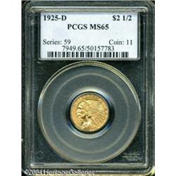 1925-D $2 1/2 MS65 PCGS. Sparkling, lustrous surfa <B>1925-D $2 1/2 MS65 PCGS.</B></I> Sparkling, lustrous surfaces with a fragile overlay of tan and gold patina. A superior coin with a strong dose of eye appeal and only one small mark in the reverse field between STATES OF. <BR><BR><B>Important notice:</B> Heritage usually auctions material at the rate of 200-250 lots per hour. On some occasions eBay Live bid software or the Internet may not be able to keep up with the pace of the auction. We recommend placing a realistic absentee bid now as insurance to avoid disappointment. Occasionally the auctioneer may eliminate or reject an eBay Live bid, and the auctioneer may also reopen a lot after the close of the eBay live bidding (usually because we missed an audience bid), and may reject your bid even if it shows you as the winning bidder. By bidding via eBay Live, you agree that Heritage may award the lot to another bidder at its sole discretion under the circumstances described above or any other reasonable circumstances. Since eBay bids are not shown to us until we open the lot on the floor, we treat those bids just like floor bids. In most cases the floor responds before the eBay bid is presented to us, due to Internet lag time, so for consistency we have made it a policy that floor bids are always considered first over tie eBay live bids. Also please note that all Heritage lots purchased through eBay Live carry a 20% Buyer's Premium. Please make sure you read the Terms and Conditions before you bid. This lot is being auctioned in conjunction with a live floor auction by Heritage Galleries & Auctioneers. All final auction and invoice information will be supplied by Heritage Galleries & Auctioneers, and all other information should be considered preliminary. Lot:6577