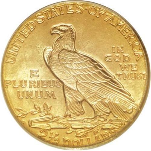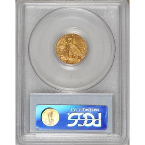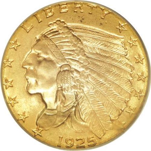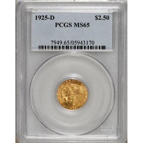 <B>1925-D $2 1/2 MS65 PCGS.</B></I> The 1925-D is one of only three Denver Mint issues in the Indian quarter eagle series. The other two coins are the 1914-D and the key-date 1911-D. With a mintage of 578,000 coins, the 1925-D quarter eagle is considered a common coin in all grades with the exception of Gem and finer. To illustrate this point, PCGS has graded a mere 28 pieces finer than MS65 and none have graded higher than MS66. Nonetheless, the 1925-D quarter eagle is obtainable in Gem condition with a bit of patience and, as such, is popular with collectors as a type coin. This is a fully struck example that is highly lustrous and covered with rich red-gold patina.<BR><BR><B>Coin Engraver:</B> Bela Lyon Pratt<BR><BR><b>Shipping:</b> Coins & Currency (<a target="_blank" href="http://www.heritageauctions.com/common/shipping.php">view shipping information</a>)