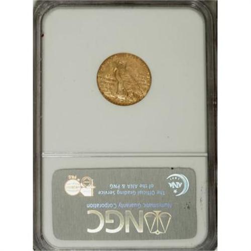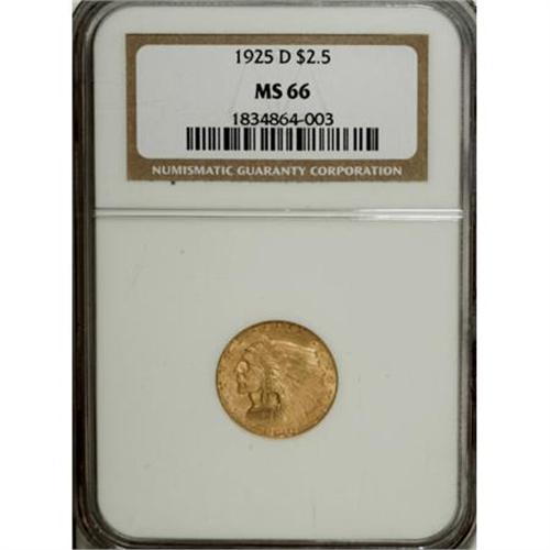 <B>1925-D $2 1/2 MS66 NGC.</B></I> Denver was the only branch mint to produce Indian Head quarter eagles, and that facility did so in only three years. The first two issues, those of 1911 and 1914, have accompanying Philadelphia issues, but the 1925-D pieces were the only quarter eagles coined for that year. Those pieces, 578,000 coins in all, were also the first representatives of the denomination struck in a decade. Most of the gold struck in the United States at the time was destined for international trade, and the export market preferred larger denominations.<BR> Like all Indian Head quarter eagles of the 1920s, the 1925-D is available through near-Gem and even Gem grades, but anything finer is conditionally elusive. This Premium Gem offers shimmering wheat-gold surfaces and strong detail. The carefully preserved devices and fields lend the piece further visual appeal. NGC has certified just one coin finer, while PCGS has graded none (7/07).<BR><BR><B>Coin Engraver:</B> Bela Lyon Pratt<BR><BR><b>Shipping:</b> Coins & Currency (<a target="_blank" href="http://www.heritageauctions.com/common/shipping.php">view shipping information</a>\)