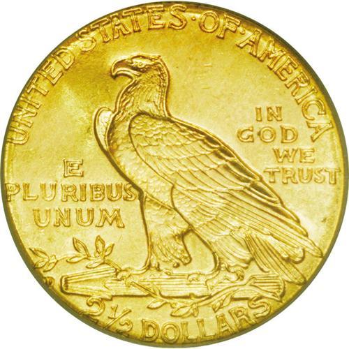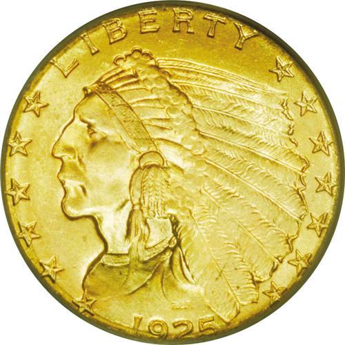 <B>1925-D<$2 1/2> MS66 PCGS.</B></I> Variegated swirls of mint-green, orange-gold, and crimson-copper shades adorn both sides of this carefully preserved 1920s Denver Mint quarter eagle. The underlying surfaces display pinpoint definition that is free of the die buckling that often accompanies survivors of this issue. For pedigree purposes, a tiny vertical toning streak is noted across the lowest feather in the Indian's headdress. Unsurpassable in all regards, this coin is one of only 28 examples graded MS66 by PCGS. It is bettered by only one example at NGC (4/06).