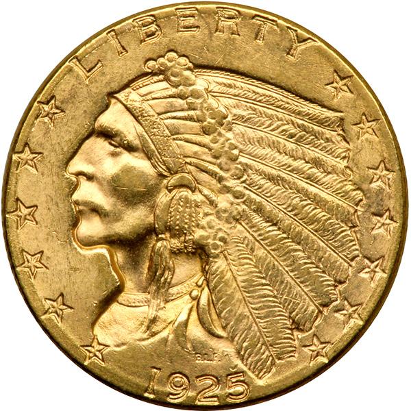 1925-D $2.50 Indian. NGC graded MS-64. Pleasant, almost cheery gold frost display lots of fresh gold color. Broadly and well struck on the legends and main device, as is typical for this D-mint date from the 1920s, which is always appreciated by collectors; a coin with bold detail at the centers (PCGS # 7949) .