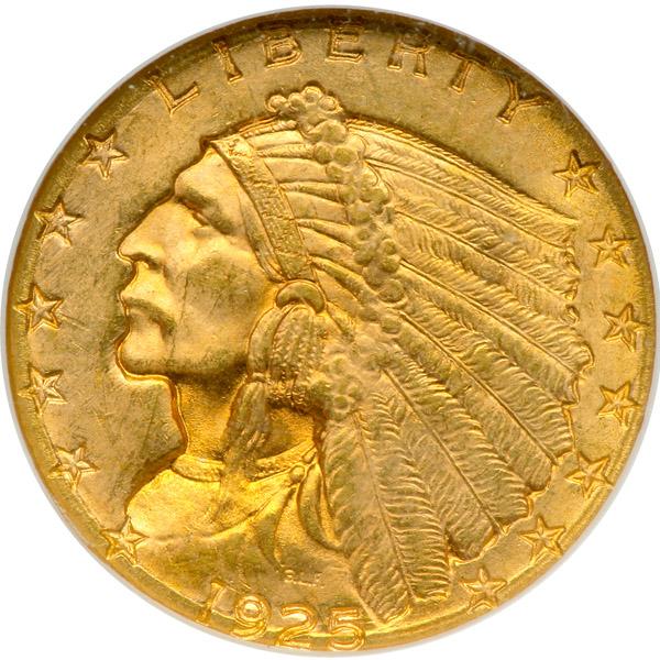 1925-D $2.50 Indian. NGC graded MS-65. Even golden toning on both sides, the coin is bright with gold-on-gold somersaulting luster whose radiance over both sides of this cleanly original example must be seen to be appreciated. A munificent strike, as well as freedom from the usual clash marks typical for this issue where insufficient die pressure occurs all too often. And that is why this is a coin to jump at before it's sale is history. One of only three Denver Mint strikes in the 15-coin Indian Quarter Eagle series, 1911-D, 1914-D, and 1925-D (PCGS # 7949) .