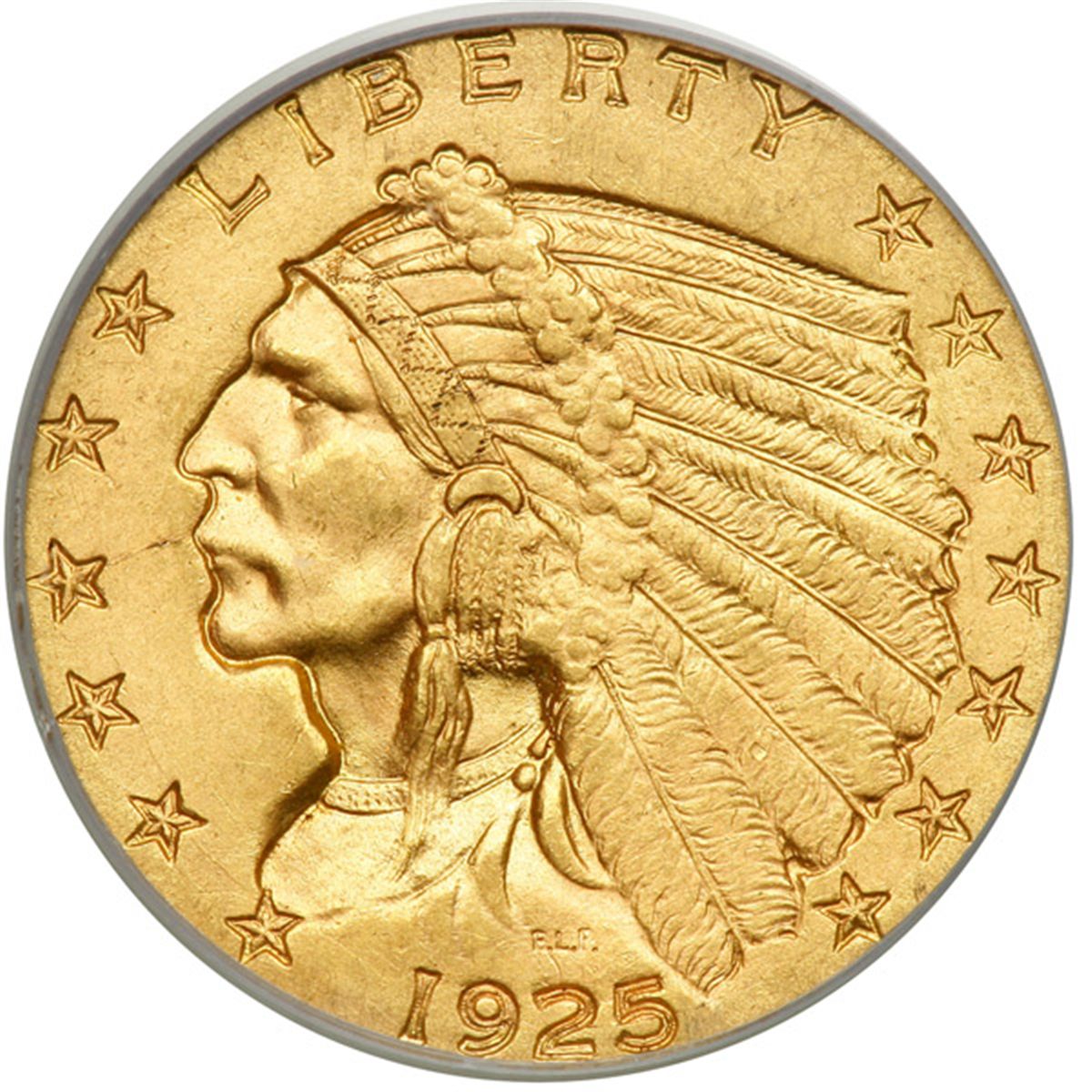 1925-D $2.50 Indian. PCGS graded MS-63 CAC Approved. Light even golden toning (PCGS # 7949) .