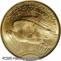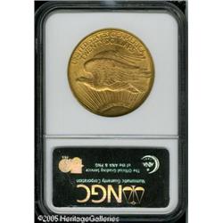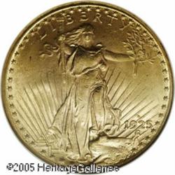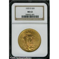 <B>1925-D $20 MS62 NGC.</B></I> Although this has one of the highest mintages in the series, it is one of the rarer dates in the series. Either most of the mintage was not released and was later melted, or nearly all entered commerce with no hoards being discovered in foreign lands. In all grades from AU58 to MS65, NGC has only certified 249 examples of this date. This example has excellent eye appeal with frosty green-gold luster. Lot:9704