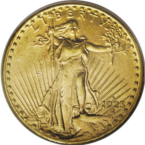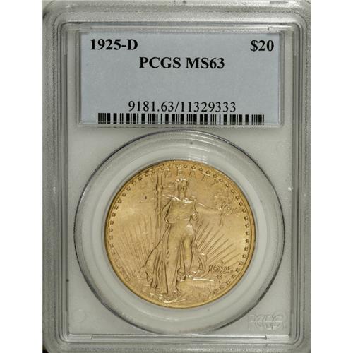 <B>1925-D $20 MS63 PCGS.</B></I> Nearly 3 million examples of this date were originally struck, and nearly 3 million were later melted, probably in the mid to late 1930s. Jeff Garrett and Ron Guth wrote in their <I>Encyclopedia of U.S. Gold Coins:</B></I> "Like the 1924-D and 1924-S issues, the vast quantity of these coins ended up in the melting pot during the late 1930s, and the seemingly large mintage was virtually eliminated." The exact number that still exist today is not known, but the quantity is certainly under 1,000 coins, and might be less than 500. This brilliant Mint State example is a satiny piece with lustrous yellow-gold surfaces and faint traces of light pink toning. Only a few trivial surface marks are evident, and the strike is above average.<BR><BR><b>Shipping:</b> Coins & Currency (<a target="_blank" href="http://www.heritageauctions.com/common/shipping.php">view shipping information</a>)