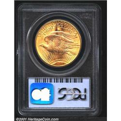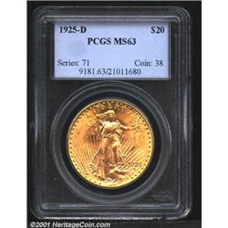 1925-D $20 MS63 PCGS.<p>While the mintage of this much coveted date approached 3 million coins, the vast majority were eventually melted into gold bars by the U.S. Government. Like the majority of survivors, this is a mint state example that is well struck and has flashy cartwheel luster. However, this coin has fewer bagmarks than most, and is choice for the grade as a result. Important notice: We expect to be auctioning lots at the rate of 200-250 per hour. Sometimes eBay Premier live bid software cannot keep up with that pace, so we strongly recommend that you place a realistic proxy bid now as insurance to avoid disappointment. Also please note that all Heritage/CAA lots purchased through eBay Premier carry a 20% Buyer's Premium.