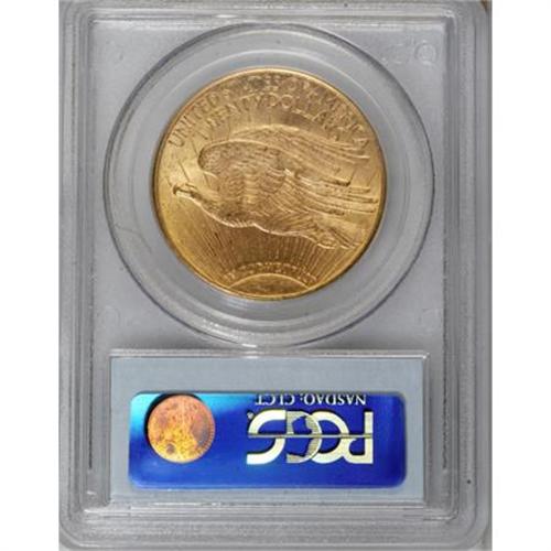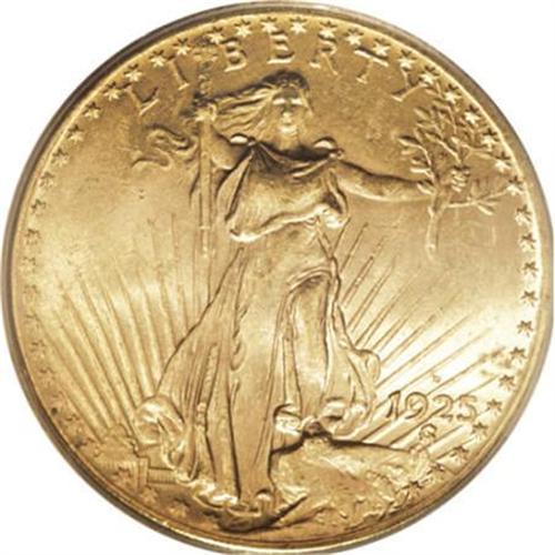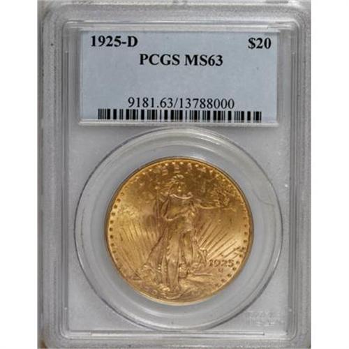 <B>1925-D $20 MS63 PCGS.</B></I> The 1925-D is one of several mintmarked, semi-key issues from the 1920s in the Saint-Gaudens series. It is scarce in all grades, but rarely encountered finer than MS63-64. As usually seen, the striking details on this piece are strongly brought up on each side. The mint luster is uncommonly thick and frosted for a Denver product, but this is consistent with other 1925-D twenties seen and is a trait that is generally found on this issue. A number of small, but individually insignificant abrasions are scattered over each side, which account for the grade. Bright pink-gold color.<BR><BR><B>Coin Engraver:</B> Augustus Saint-Gaudens<BR><BR><b>Shipping:</b> Coins & Currency (<a target="_blank" href="http://www.heritageauctions.com/common/shipping.php">view shipping information</a>)