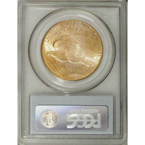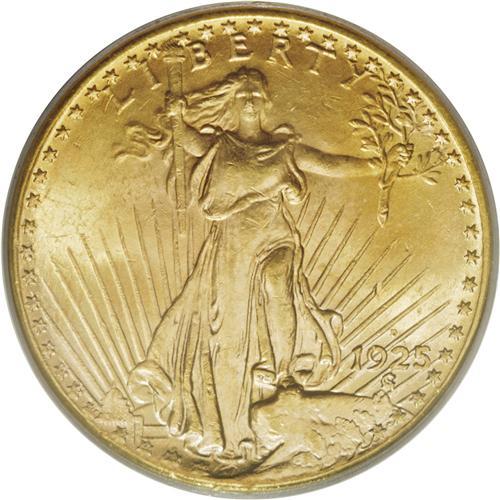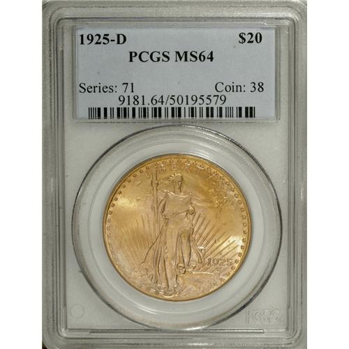 <B>1925-D $20 MS64 PCGS.</B></I> Although a few dozen coins exist at the MS64 level, one grade point finer this issue is a rare bird indeed, with only 13 Gems graded at NGC and PCGS combined (4/07). Much of the issue was melted in the late 1930s, so that near-Gems such as the present piece are the finest examples readily obtainable. This piece displays lustrous pinkish-gold surfaces with a few scattered light field abrasions and a premium appearance. Although the strike is bold overall, a touch of weakness is noted on the dome of the Capitol building.<BR><BR><b>Shipping:</b> Coins & Currency (<a target="_blank" href="http://www.heritageauctions.com/common/shipping.php">view shipping information</a>)