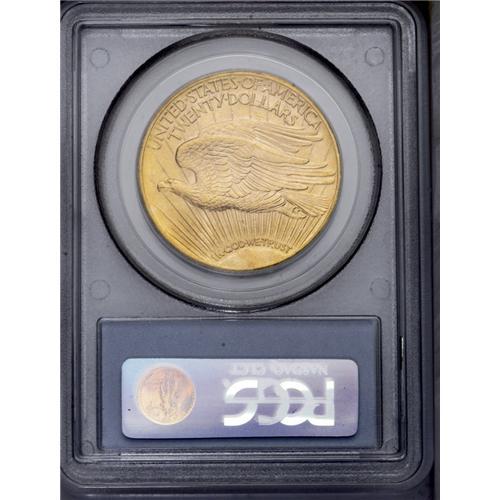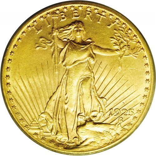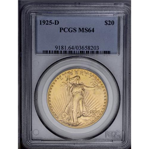 <B>1925-D<$20> MS64 PCGS.</B></I> The mintmarked issues in the 1920s are generally characterized by significant mintages, yet most are scarce or rare issues. Dave Bowers wrote: "The 1925-D is another entry in the enticing lineup of later-date Saint-Gaudens mintmarks that once were rare, but today are less so, although it remains very elusive. Most are in the lower Mint State ranges and probably came from French banks in recent decades." At the Choice MS64 grade level, enough have been certified that any collector of means can own an example. However, at the next grade level, this date is extremely rare. This example is an attractive representative, having sharp design details on both sides. In fact, nearly all aspects of the design are boldly rendered. The surfaces have satiny luster with faint reflectivity in the fields, and they exhibit brilliant yellow color with faint rose highlights. <BR><BR><B>Important notice:</B> Heritage usually auctions material at the rate of 200-250 lots per hour. On some occasions eBay Live bid software or the Internet may not be able to keep up with the pace of the auction. We recommend placing a realistic absentee bid now as insurance to avoid disappointment. Occasionally the auctioneer may eliminate or reject an eBay Live bid, and the auctioneer may also reopen a lot after the close of the eBay live bidding (usually because we missed an audience bid), and may reject your bid even if it shows you as the winning bidder. By bidding via eBay Live, you agree that Heritage may award the lot to another bidder at its sole discretion under the circumstances described above or any other reasonable circumstances. Since eBay bids are not shown to us until we open the lot on the floor, we treat those bids just like floor bids. In most cases the floor responds before the eBay bid is presented to us, due to Internet lag time, so for consistency we have made it a policy that floor bids are always considered first over tie eBay live bids. Also please note that all Heritage lots purchased through eBay Live carry a 20% Buyer's Premium. Please make sure you read the Terms and Conditions before you bid. This lot is being auctioned in conjunction with a live floor auction by Heritage Galleries & Auctioneers. All final auction and invoice information will be supplied by Heritage Galleries & Auctioneers, and all other information should be considered preliminary. Lot:4726 <BR><BR><B>Winning Notification and Billing:</B> After the FINAL session in this auction is complete, Heritage will send e-mail and snail mail invoices. This process normally takes several days. All final auction and invoice information will be supplied by Heritage Galleries & Auctioneers, and all other information should be considered preliminary. <BR><BR>This auction will be conducted on a live auction floor and over the Internet through eBay Live. If you choose to place an absentee bid, please take a moment to <font color='#0000ff'><u><a href='http://pages.ebay.com/liveauctions/help/before/laabsentee.html'>learn how eBay Live absentee bidding works</a></u></font><font color='#000000'>