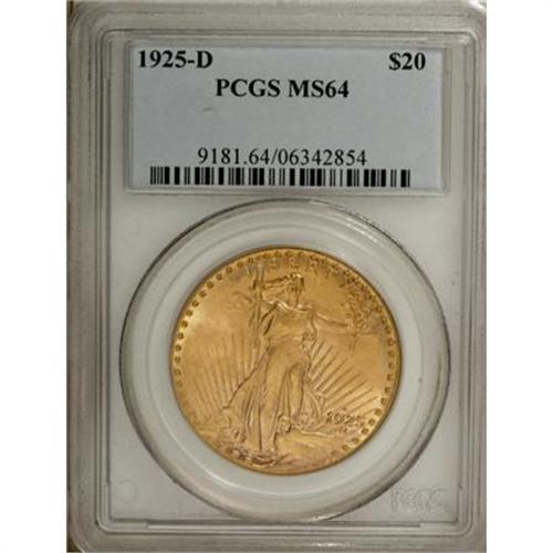 <B>1925-D $20 MS64 PCGS.</B></I> The 1925-D is one of several heavily melted branch mint issues that has appeared only infrequently in European gold hoards. Appealing examples prove highly challenging, particularly in Select and better states; Gem and finer examples are undeniable rarities.<BR> This gorgeous Choice piece is immensely appealing with bright, powerful luster and pink-gold accents against sun-gold surfaces. The overall definition is bold for the issue, and the surfaces, though faintly marked, have a better appearance than its MS64 designation might suggest. At once appealing and accessible, this lovely example offers a great opportunity for the knowledgeable collector. PCGS has certified just five finer pieces (11/07).<BR><I>From The Jacob Collection of Saint-Gaudens Double Eagles.</B></I><BR><BR><B>Coin Engraver:</B> Augustus Saint-Gaudens<BR><BR><b>Shipping:</b> Coins & Currency (<a target="_blank" href="http://www.heritageauctions.com/common/shipping.php">view shipping information</a>)