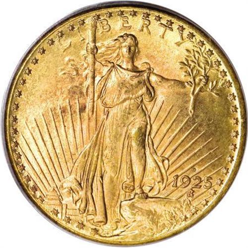 <B>1925-D $20 MS66 PCGS.</B></I> Nearly 3 million double eagles were struck at the Denver facility in 1925. Many of these were sent to Europe, primarily to Swiss and French banks, as exchange payments. These represented the bulk of the coins that escaped the melting pots of the 1930s. According to David Bowers in his book <I>American Coin Treasures and Hoards:</B></I> "During the late nineteenth and early twentieth centuries Swiss and other foreign banks were not the slightest bit interested in holding United States paper money, and when President Franklin D. Roosevelt called in gold coins in 1933-1934, Swiss and other banks held on to their gold reserves more tightly than ever."<BR> With respect to rarity, gold specialist David Akers, in his treatise entitled <I>A Handbook of 20th-Century United States Gold Coins, 1907-1933,</B></I> states: "In most respects, the 1925-D is very similar in rarity to the 1924-D although, in my experience, it is slightly rarer than the 1924-D in the highest Mint State grades. At one time, the 1925-D was considered to be a major rarity, much more rare than the 1920-S, 1930-S, 1931 and 1932, among others. A few small hoards were subsequently discovered and, even today, there is reportedly a small hoard intact of perhaps as many as 80 to 100 pieces. However, it is likely that the total number of Mint State pieces in existence is still fewer than 200. Most of the known Mint State pieces are MS63 or less and in MS64 condition, the 1925-D is extremely difficult to locate. I have seen a very few small number of true gems, maybe as many as four or five, and I assume that others exist, hence my R-8 rarity rating."<BR> In light of current PCGS and NGC population statistics (in which about 500 Mint State coins have been seen), Akers' estimates of "fewer than 200" Uncirculated 1925-D pieces extant was likely somewhat off (though many examples in the certified population are presumably resubmissions). His estimate of surviving "true Gems," however, is in line with the population data - only 10 MS65 coins have been certified, and a mere three MS66 specimens, with none finer.<BR> An impressive strike emboldens the design elements of this Premium Gem example; sharp detail is apparent on the Capitol building, Liberty's face, the fingers of both hands, the toes, and on the eagle's plumage. Both sides exhibit frosted surfaces that radiate intense luster and are adorned with varying shades of apricot and yellow-gold color imbued with traces of mint-green. A couple of minute marks on the torch may help in identification of this lovely specimen that is among the finest known. Population: 2 in 66, 0 finer (7/07).<BR><BR><B>Coin Engraver:</B> Augustus Saint-Gaudens<BR><BR><b>Shipping:</b> Coins & Currency (<a target="_blank" href="http://www.heritageauctions.com/common/shipping.php">view shipping information</a>\)
