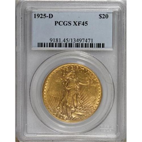 <B>1925-D $20 XF45 PCGS.</B></I> Nearly 3 million 1925-D double eagles were struck, but only a fraction of the production escaped Treasury vaults prior to the FDR gold recall. The 1925-D is very scarce in Mint State, but it is extremely rare below the AU55 grade. PCGS has certified only two such pieces, the present lot and an AU50.<BR><BR><B>Coin Engraver:</B> Augustus Saint-Gaudens<BR><BR><b>Shipping:</b> Coins & Currency (<a target="_blank" href="http://www.heritageauctions.com/common/shipping.php">view shipping information</a>)