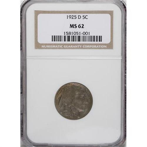 <B>1925-D 5C MS62 NGC.</B></I> NGC Census: (58/360). PCGS Population (61/536). Mintage: 4,450,000. Numismedia Wsl. Price for NGC/PCGS coin in MS62: $400. (#3955)<BR><BR><B>Coin Engraver:</B> James E. Fraser<BR><BR><b>Shipping:</b> Coins & Currency (<a target="_blank" href="http://www.heritageauctions.com/common/shipping.php">view shipping information</a>)