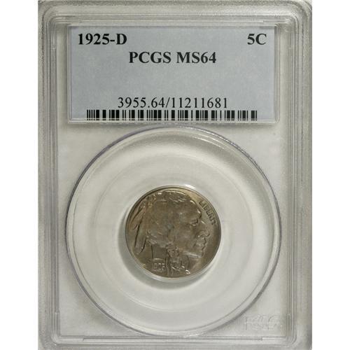 <B>1925-D 5C MS64 PCGS.</B></I> Iridescent violet, lavender, and powder-blue toning coats highly lustrous surfaces, and the design elements are much better defined than usually seen on this poorly struck issue. Most of the hair detail shows on the bison's hump and head, and the horn is sharp (these areas show flatness on many examples). Well preserved for the grade designation.<BR><BR><b>Shipping:</b> Coins & Currency (<a target="_blank" href="http://www.heritageauctions.com/common/shipping.php">view shipping information</a>)