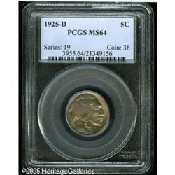 <B>1925-D 5C MS64 PCGS.</B></I> This medium-gold colored D-mint example reveals slightly better detail, especially on the reverse, than is average for the issue, which is typically weakly struck. No significant abrasions or spots interrupt the generally well preserved surfaces. Lot:6001