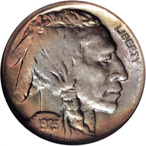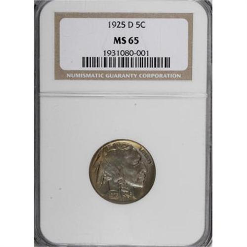 <B>1925-D 5C MS65 NGC.</B></I> A beautifully toned piece with bright blue in the centers that is surrounded by golden at the rims. Widely regarded as one of the great strike rarities in the series, this piece shows the usual softness of highpoint detail. However, when compared to other '25-D nickels, this piece is far above average and actually shows good definition on the obverse. Census: 54 in 65, 8 finer (8/07).<BR><BR><B>Coin Engraver:</B> James E. Fraser<BR><BR><b>Shipping:</b> Coins & Currency (<a target="_blank" href="http://www.heritageauctions.com/common/shipping.php">view shipping information</a>)
