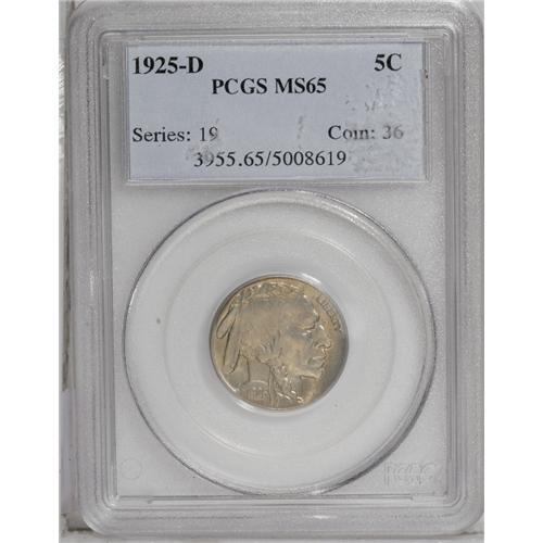 <B>1925-D<5C> MS65 PCGS.</B></I> Lustrous and lightly toned in lilac, yellow-gold, and ice-blue. While the striking definition is somewhat soft on the Indian's braid and feathers, the date and LIBERTY are sharp, as are the hair on the bison's head and the horn, areas that are typically poorly struck on this issue. A few tiny pepper-like toning spots are scattered over the obverse, and a couple of trivial contact marks are noted on the Indian's face. Population: 59 in 65, 3 finer (6/06).