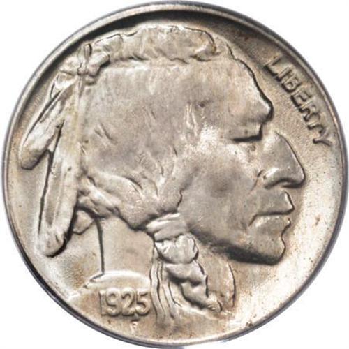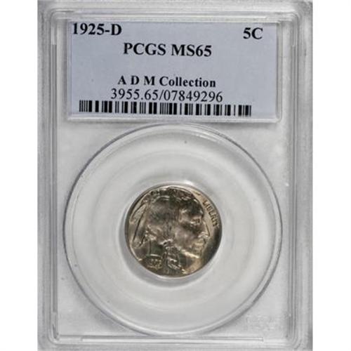 <B>1925-D 5C MS65 PCGS.</B></I> Ex: ADM Collection. This particular coin could lead one to conclude that strike is not a problem on this issue. Just the opposite is the case, as is well known to specialists. However, the reverse is unusually well defined with sharp definition on the bison's head and tail. The obverse shows just a bit of softness. Simply outstanding definition for this issue. The mint luster tends more to the frosted side than the expected satiny variant. Lightly and attractively toned. Just a lovely, problem-free piece in all regards. Population: 71 in 65, 3 finer (8/07).<BR><BR><B>Coin Engraver:</B> James E. Fraser<BR><BR><b>Shipping:</b> Coins & Currency (<a target="_blank" href="http://www.heritageauctions.com/common/shipping.php">view shipping information</a>)