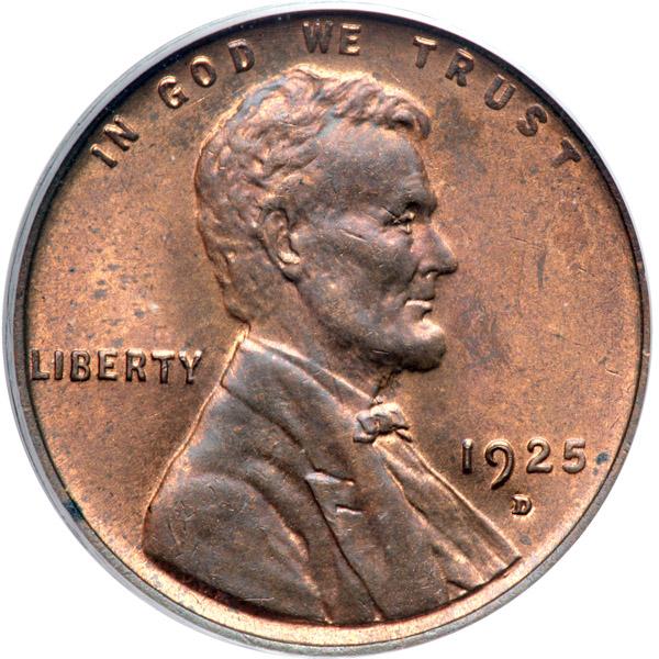1925-D. PCGS graded MS-64 Red & Brown. Plenty of Mint Red present; sharper than average on the obverse, with typical detail on the reverse (PCGS # 2562) .