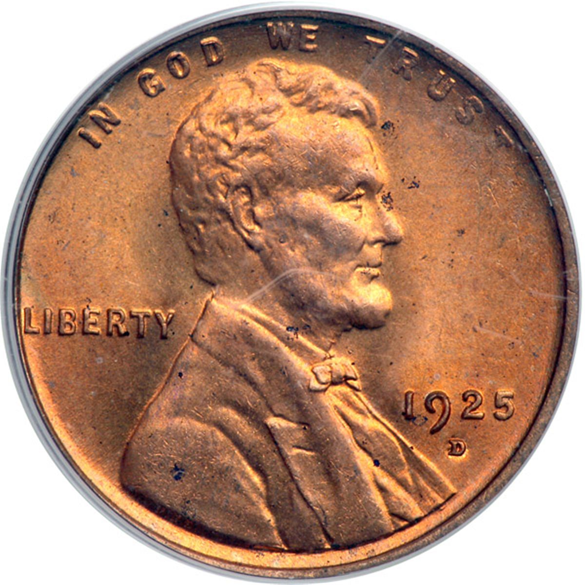 1925-D Lincoln Cent. PCGS graded MS-64 Red. A choice Mint Red example. Desirable early D-mint that is rarely available in full mint red. Pop 232; 46 finer (PCGS # 2563) .