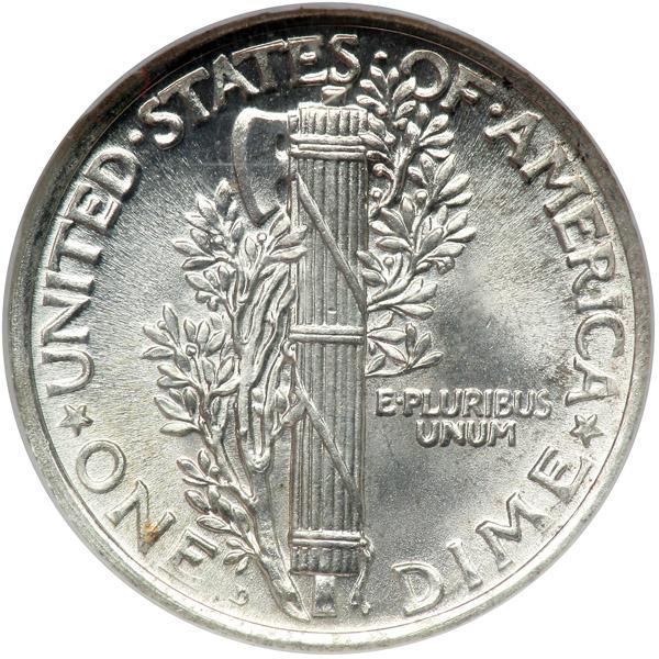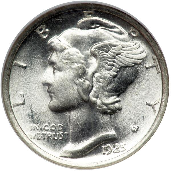 1925-D Mercury Dime. NGC graded MS-67 Full Bands. A spectacular blast white gem! With experts and specialist collectors in the series always looking for top-end pieces, we feel confident they will flock to obtain a high-end example in the present lot. Since most representative 1925-D dimes bear evidence of a less than stellar strike and indifferent mint luster, NGC has certified a mere quartet of pieces at the Gem 67 numeric designation (none beyond), with our offering ranking among the finest known at that service. Born from an original mintage of 5.1 million pieces, the example in the present lot reveals an completely untoned obverse & reverse sporting iridescence silvery whiteness throughout. Neither side has an overt abrasion, as one should look forward to at this sublime numeric grade; the textured surfaces support a satiny sheen of mint luster. The strike is, for all intents and purposes, 100% exact, with the horizontal bands rounded and crisp. Certainly a piece for the specialized collector, and worthy of a premium bid as such. Pop 4; none finer.