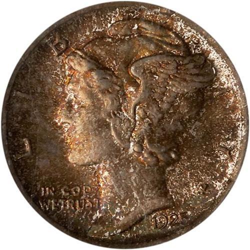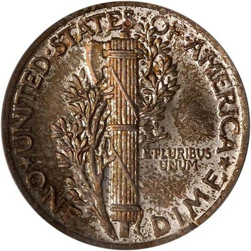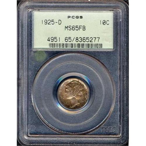 <b>1925-D Mercury Dime. PCGS graded MS65 FB.</b> A simply stunning example, the strike is noteworthy for this often poorly produced type. The focal features are all sharply defined, and the luster is full with a richly frosted sheen. Covered with toning, the color is a mixture of light silver-gray dappled with warm reddish amber and brown. The reverse has more silvery elements in the color than the more thoroughly toned obverse. In more respects than one, the dies that struck this desirable 1925-D dime left their rigid impression behind without even the slightest weakness or imprecision, only a few are ever found this way with Full Bands. Sharp, even at the key centers. A wonderful Gem! <b>(PCGS # 4951)</b>