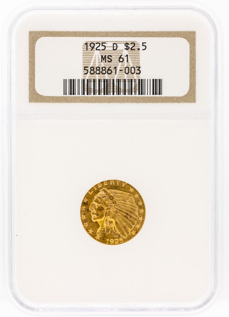 One 1925-D NGC MS61 $2.50 Indian Head Quarter Eagle Gold Coin. NGC Certified.