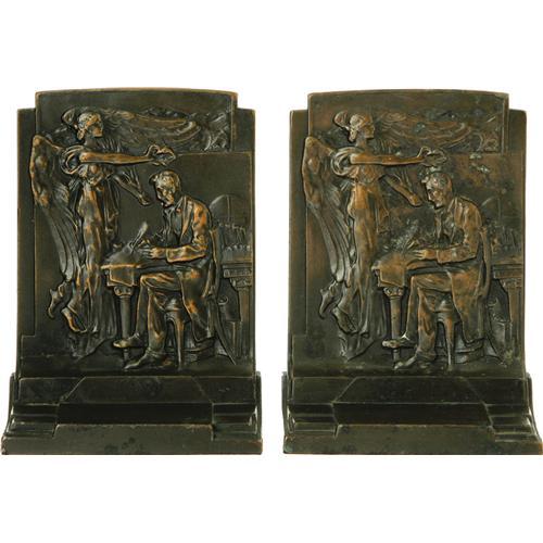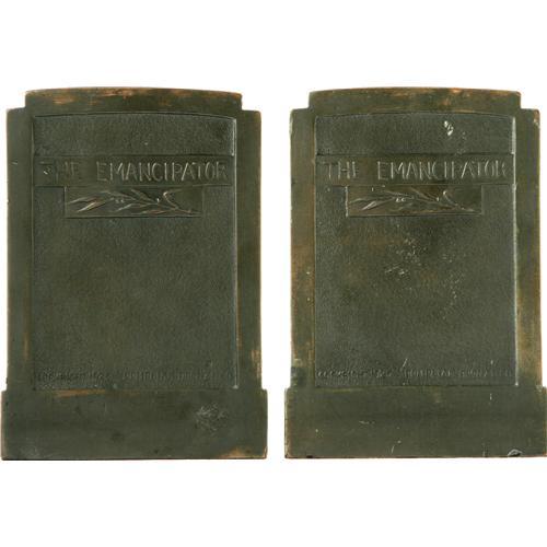 <B>1925-Dated Abraham Lincoln Cast "Emancipator" Bookends</B></I> by the Pompeian Bronze Company. Each of these matching copper-coated zinc bookends are 3.75" x 5.5" x 2" in size, heavy (three pounds each), and pictures an angel appearing to Lincoln as he sits at his desk writing. The verso is titled "THE EMANCIPATOR" and signed by the manufacturer. Wonderful Art Deco style and in generally excellent condition with some light verdigris on one.<BR><BR><b>Shipping:</b> Miscellaneous Collectibles, Larg (<a target="_blank" href="http://www.heritageauctions.com/common/shipping.php">view shipping information</a>)