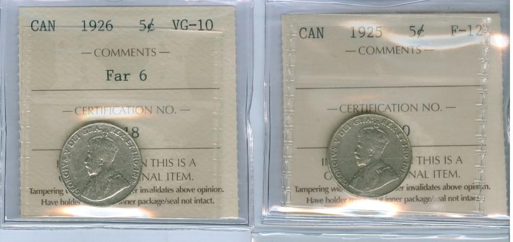 1925 F12 and 1926 Far VG10 5¢ . Lot of 2 ICCS graded coins,